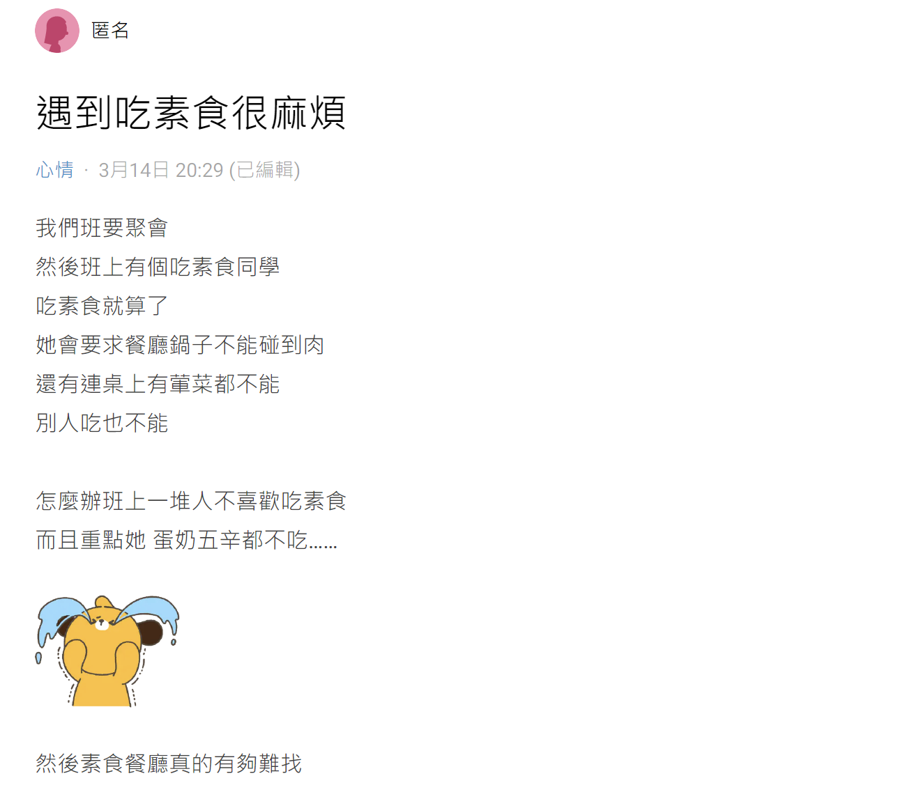 「讓班上所有人都知道她的機掰要求,直接在群組@她『因為xx說她吃素,鍋子不能碰到肉,桌上也不能有肉,大家對餐廳選擇有什麼提議嗎?』」