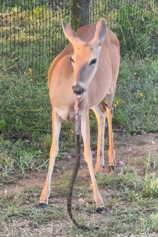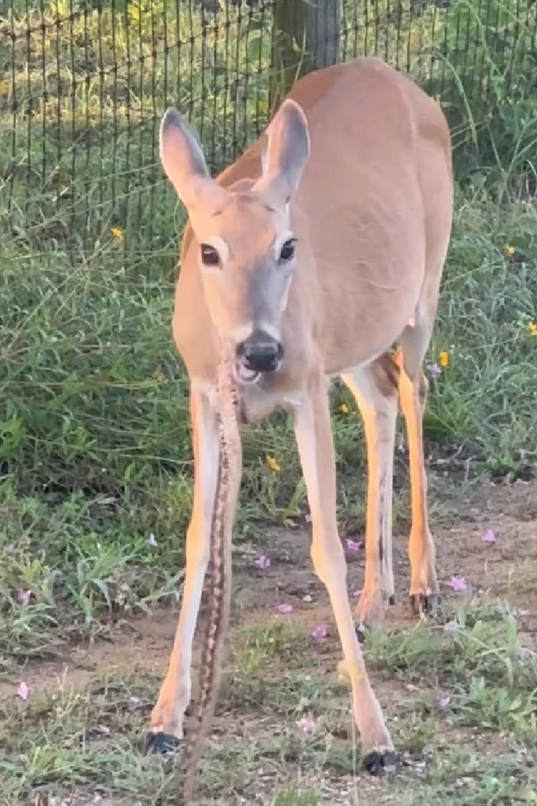 這、這不是我認識的小鹿斑比吧?!一般人認知中,外表溫和可愛的鹿就是「吃素的」草食性動物,沒想到最近國外就有民眾目睹了一隻野鹿正在叼著一條長長的、像是草繩的東西在嚼食,沒想到鏡頭拉近一看竟發現驚人的一幕——
