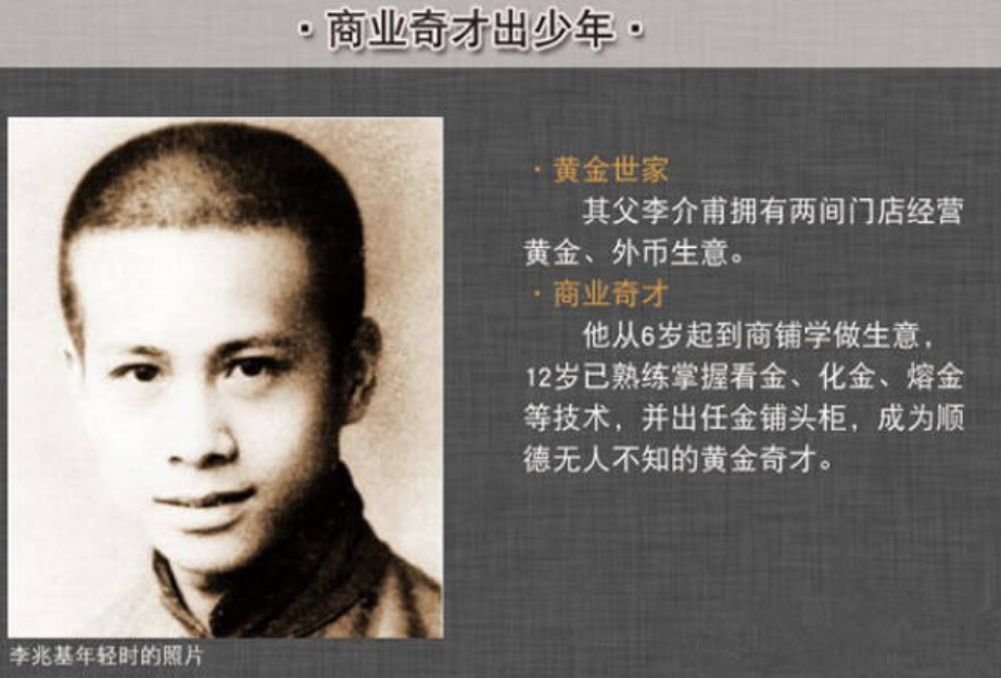 從小家境富裕的李兆基,幼年能接受私塾教育,一邊跟著父親學做生意,12歲就能成為掌櫃,15歲的時候已經能運營好兩間店鋪,拿著父親給的1000元,去到香港創業,到了20歲的時候,已經在香港做到有了二三十間金銀店,被外界出譽為「商業店」。