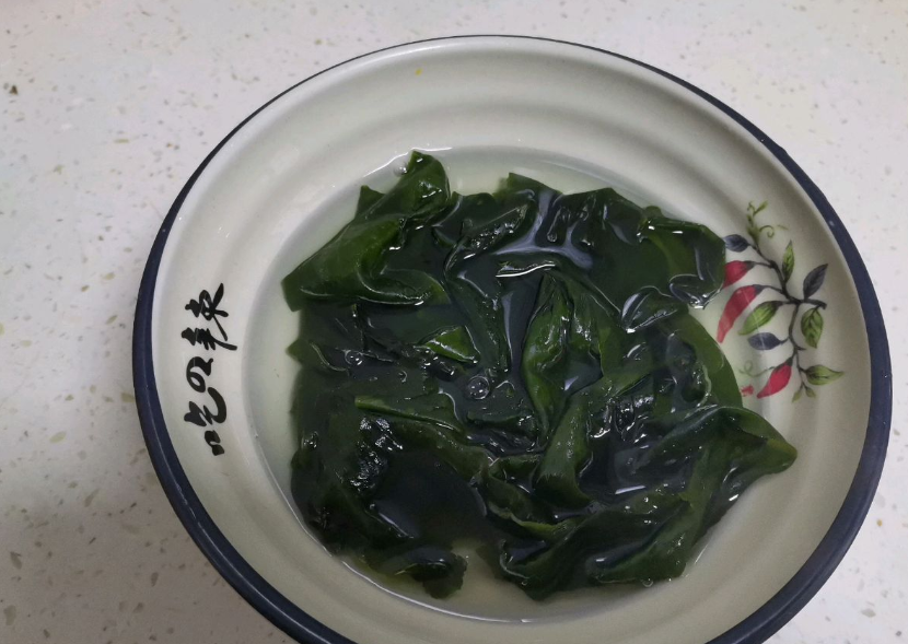 2、起鍋燒油,油熱后打入3顆雞蛋煎至金黃撈出,改刀切成塊狀。緊接著用鍋中的底油,爆香蒜末和蔥花,香味飄出后加入裙帶菜簡單翻炒一下。
