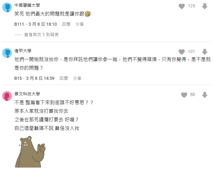 事後原PO也發文用自己的經歷,勸告大家以後出國玩要謹慎選擇旅伴,更生氣強調「吃素的人真的很麻煩」。然而眾多網友們反過來指責他,認為他應該檢討自己貿然加入別人的行程,「他們應該是想跟A男出國,可是不想跟你出國」、「你一個半路殺進來想強迫一起出去玩的人,就應該好好配合大家的安排,而不是要求全部的人為了你而做出改變,尤其是吃這種重要的環節。」、「他們一開始出國一定就建立在可以配合對方飲食,你是後來才要求要跟團的,本來就應該配合人家 」 。