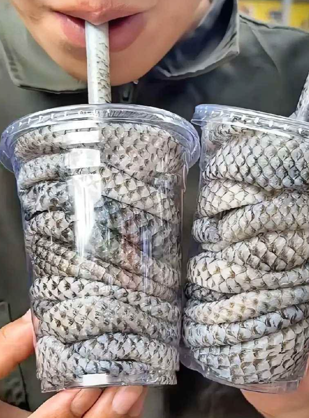 只見杯中裝滿了類似蛇皮的東西,灰白色鱗狀紋路盤繞其中,看起來頗為嚇人。他驚恐地發問:「這能吃嗎?萬一喝下去長寄生蟲怎麼辦?」無論同學如何勸說,他都不敢嘗試。