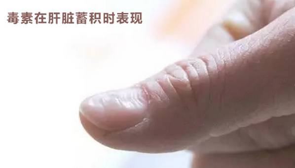 中醫學中認為「肝主筋」,而指甲是「筋」的一部分,所以當毒素在肝臟中積蓄的時候,在我們的指甲上會有明顯的信號。認真的觀察你的指甲表面,如果發現有一些凸起的綾線或者有向下凹陷的話,那麼你的肝臟就會有毒素了