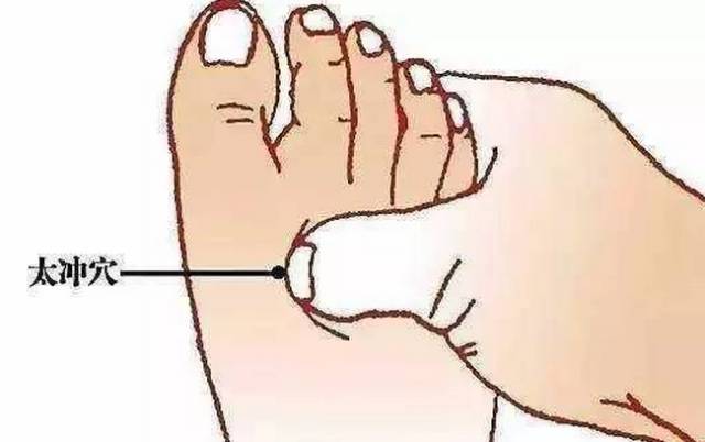 太沖穴,位置在足背第一、二跖骨結合部之前的凹陷中。用拇指按揉3~5分鐘,感覺輕微酸脹即可。不要用太大的力氣,兩隻腳交替按壓。