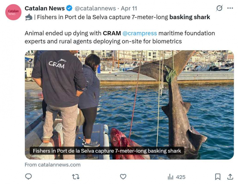 Capturat, accidentalment, un tauró peregrí de 7m al Port de la Selva pic.twitter.com/eH92ufjSxD