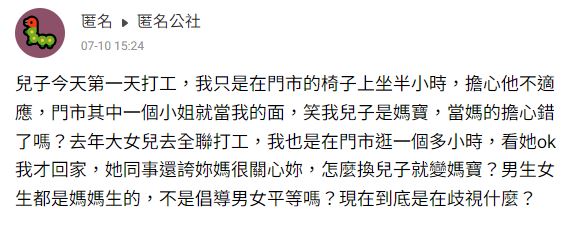 據《ctwant》報導,原PO育有一對子女,去年大女兒去全聯打工,她在門市逛了一個多小時,看孩子OK才回去,「她同事還誇,妳媽媽很關心妳耶~」所以最近兒子第一天去打工,她也在門市的椅子上坐著,「門市一個小姐就當我的面,笑我兒子媽寶!男生女生都是媽媽生,不時倡導要平等?到底是在歧視什麼?」