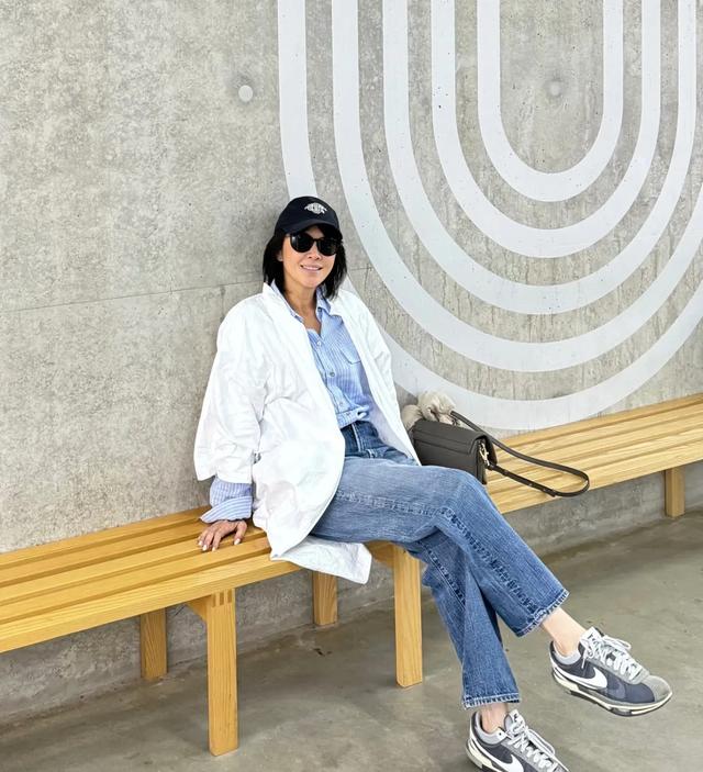 譬如:藍色九分牛仔直筒褲,內搭藍色豎條紋襯衫,外搭一件白色寬鬆款的防晒衣!頭戴棒球帽和墨鏡!遠遠看上去,氣場十足!