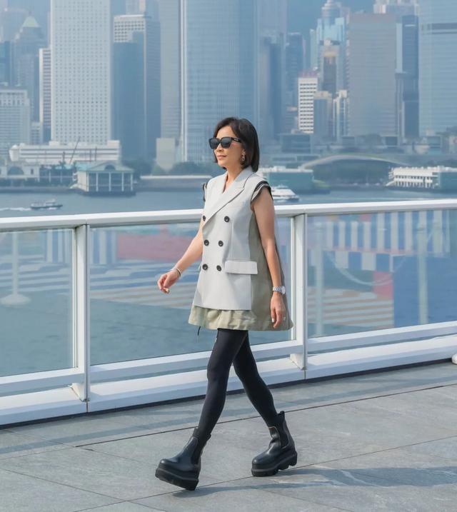 劉嘉玲穿了一件杏灰色的無袖翻駁領雙排扣拼接長馬甲,搭配一條黑色緊身褲,腳是黑色短靴,看起來胳膊上無贅肉,髮型清爽利落。