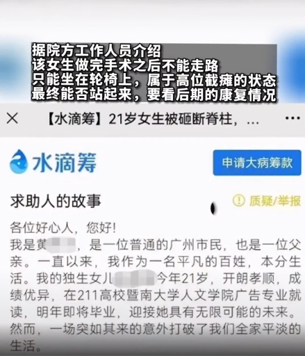 女大生的爸爸上網求助,表示自己只是普通工資的家庭,但是女兒經過8個小時的手術後,下半身仍然癱瘓,身體更是因為疼痛而沒辦法入睡,醫生表示如果要到完全康復,可能要花上好幾個月的時間,而第一次的手術花掉約人民幣11萬元(約新台幣48萬元),後續住院每天又要花人民幣1500元(約新台幣6600元),雖然已經扣掉了廠商責任、學生醫保、商場墊付的20萬(約新台幣88萬元),只是也沒辦法像中年男子求償,目前仍然沒辦法補上醫療財務的支出。