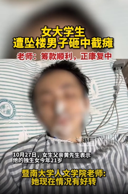 據《中天新聞網》報導,中國一名女大生跟同學在商場的椅子上休息,孰料天外飛來橫禍,一名中年男子,從高空中墜下,不偏不倚地砸中了這名女大生,因為撞擊力道猛烈,女大生當場外傷嚴重,除此之外,還因為神經嚴重受損,導致下肢整個癱瘓,雖然被送醫急救撿回一命,但是人生從此改變,女大生的父親也哀痛地說,女兒成績優異、平常也很乖巧,原本明年就要準備畢業,迎接大好人生,誰知道發生這樣的悲劇。