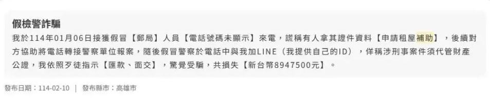 根據《Yahoo奇摩新聞》報導,內政部今年推出「擴大租金補貼專案計畫」,不僅吸引租屋族趨之若鶩申請,也被詐騙集團盯上!有受害者在1月6日接獲自稱是郵局人員打來的電話,通知他證件資料被盜用來申請租屋補助,更協助受害者將電話轉接警察單位接案,讓受害者深信不已。