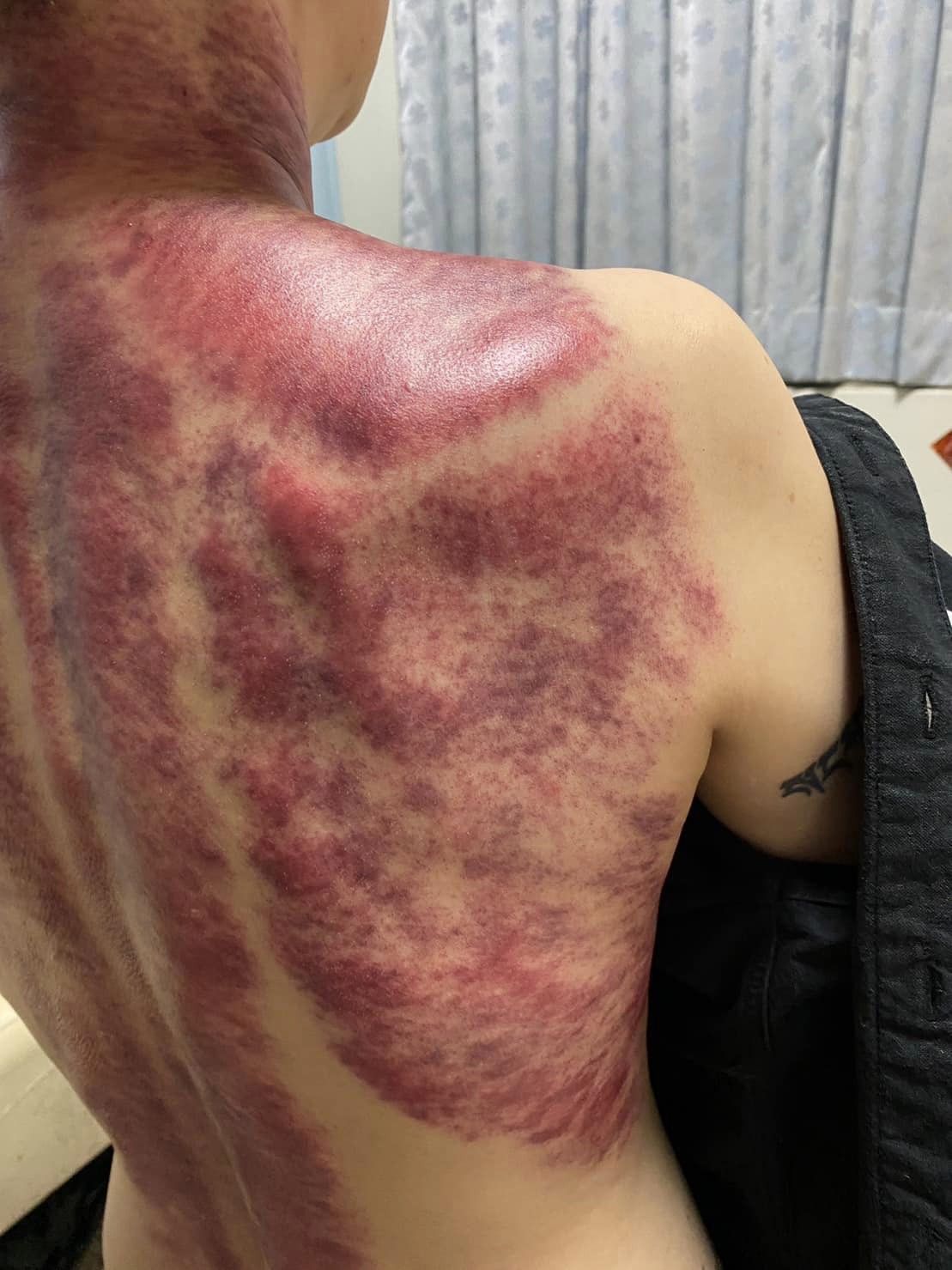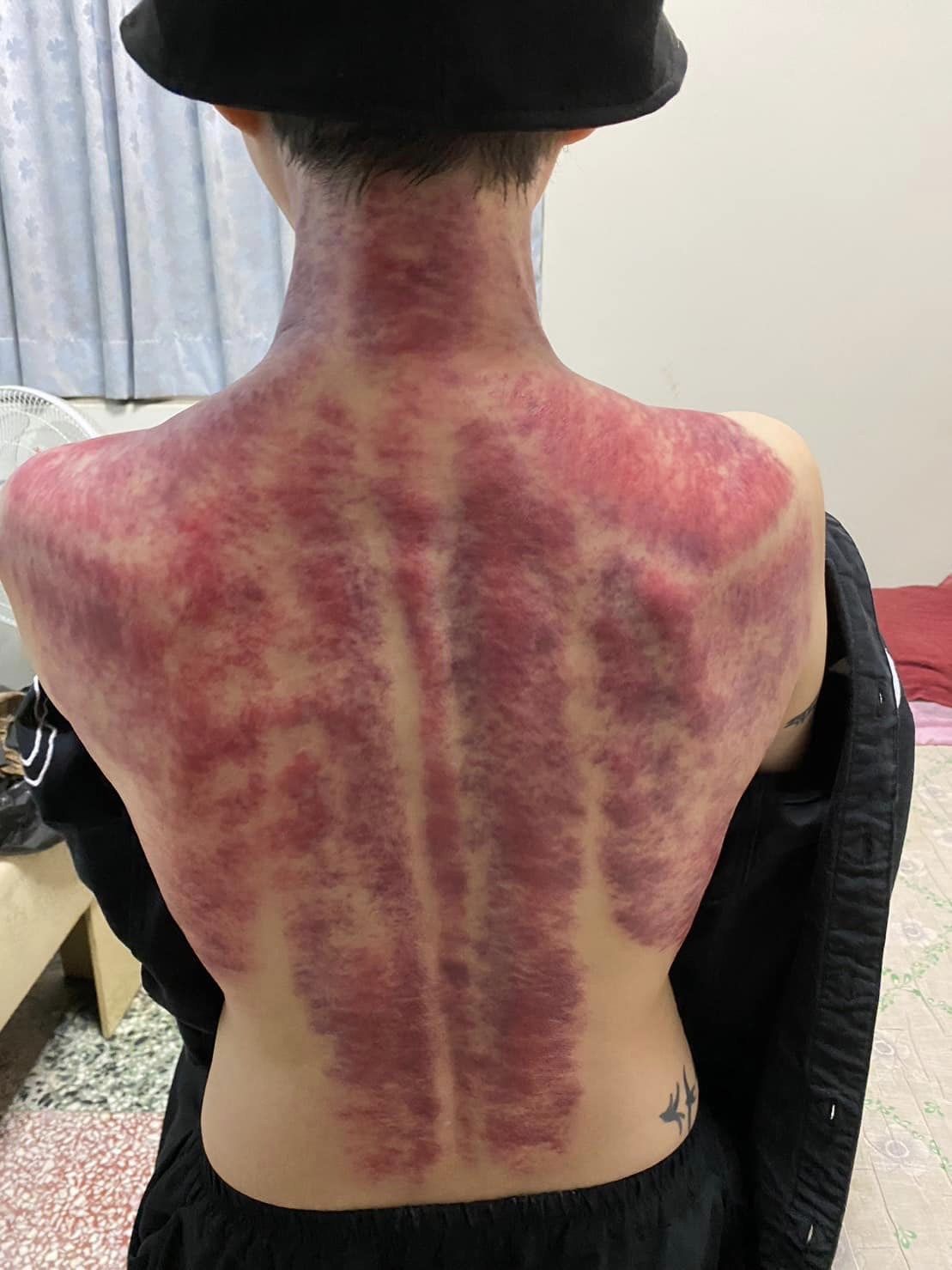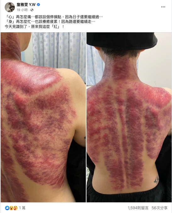 從照片中可見,詹雅雯背部的紫紅色血痕佈滿整片背,從脖子、肩膀,一路延伸至腰脊,顏色深且範圍廣,怵目驚心的畫面立刻引來大票網友和好友關心:「老師要多多保重身體!」、「老師不要太累,每天開心快樂最重要」「保重身體,我還要聽妳唱歌來治癒我的心,祝福妳早日康復」。