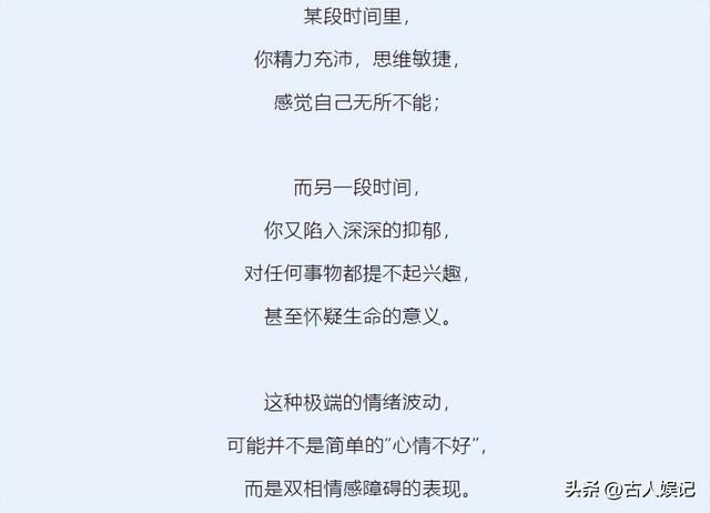 在狂躁期時,他們會極度興奮、充滿活力,好像一隻不知疲倦的「哈士奇」。反觀失落時,他們會異常消沉、絕望感覺遍布全身,甚至看到一隻螞蟻在搬運食物,也會替它感到悲傷。