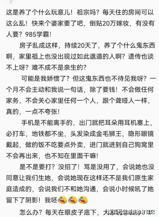 這個時候想培養她好好收拾家務、整理內務,基本上很難了。網友們指出了一個深層次的問題,家長覺得孩子在家這樣邋遢就是養廢了,卻不知道這樣的女生在大學宿舍裡是什麼狀態,如果她的宿舍比家裡還亂,那確實也不值得一提了。