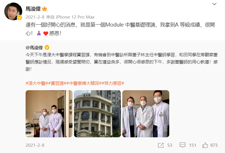 他念中醫課程,自修《黃帝內經》,還拿到了A等成績。