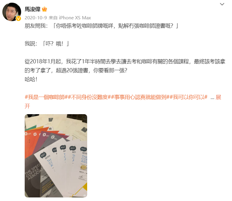 他花了整整一年半,考取了20張咖啡師證書。
