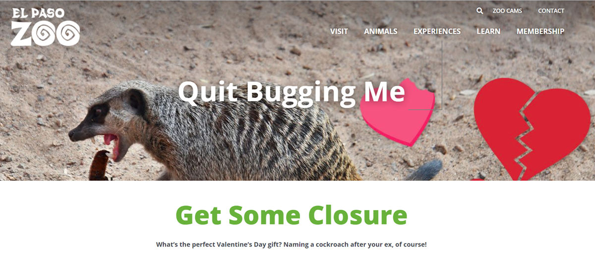 艾爾帕索動物園的活動則叫做「Quit Bugging Me」,園方會派出狐獴、鳥類、猿猴或浣熊、海獅等動物來擔任「爛情人終結者」,想參加的人只須上網登記名字不用付錢,不過活動名額有限,如果提供捐款被挑選到的機會才比較高,動物們吃掉前任時同樣會唱名和直播,保證讓各位怨男怨女滿意!