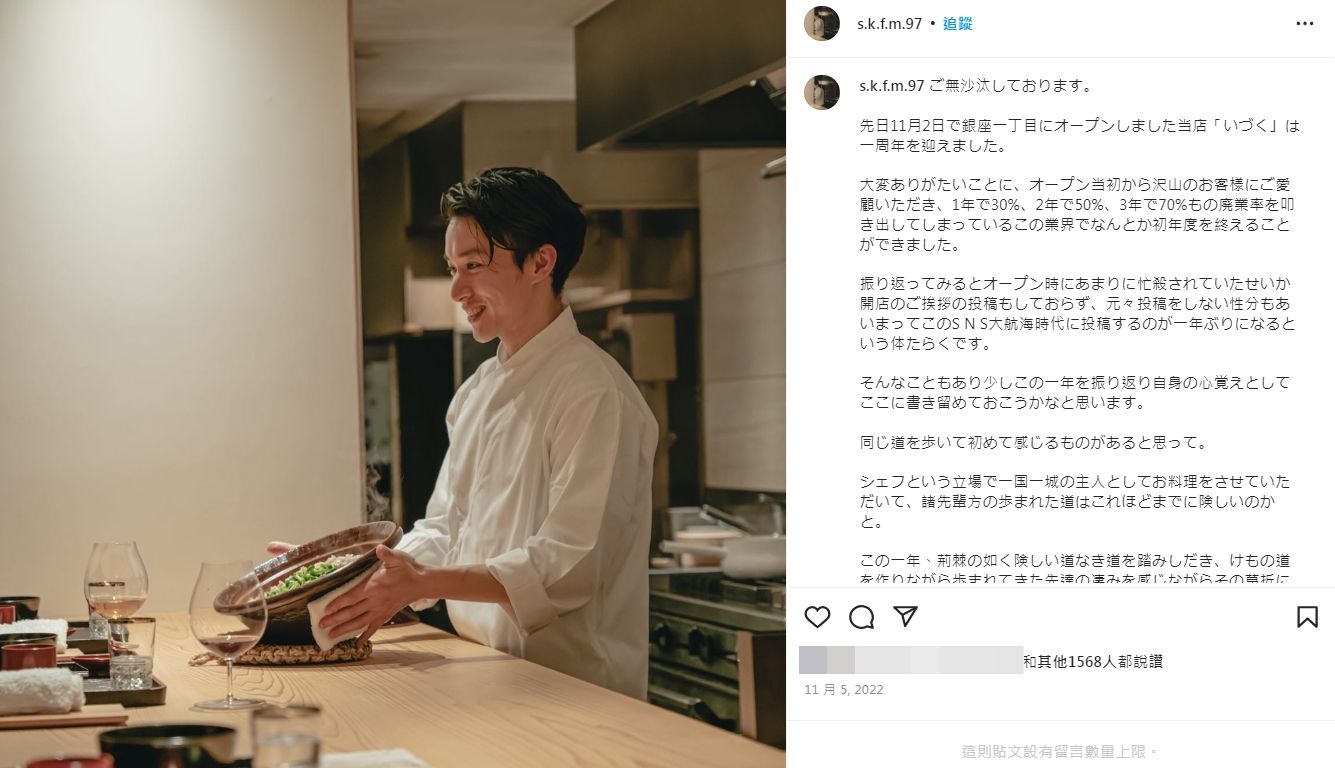 他在累積實績與人氣之後,於2年前在銀座開設高級日料店「IZUKU」,成為政界、財經界、上流貴族最喜歡造訪的餐廳之一。也因為顧客來頭不小,該店套餐訂價極高,為3.5萬日幣(約新台幣8229元),加上飲料最低消費就要5萬日幣(約新台幣1萬1755元)。因為他的帥氣外貌,令不少名流為他傾心,甚至不惜買下高價的酒,只為吸引他的注意。此外,他還開設IG、YouTube頻道,立刻就吸引超過萬名粉絲追蹤,可說是非常受歡迎。