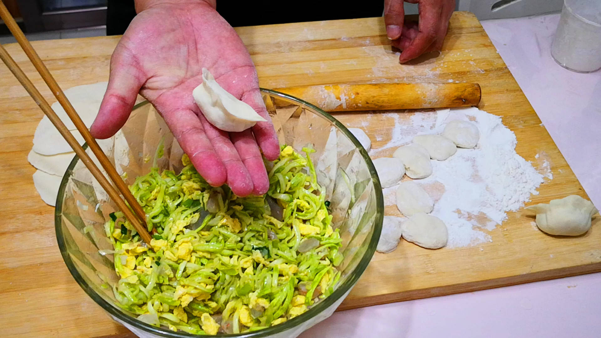 翠玉瓜洗凈後對半切開,然後去掉瓜瓤後擦成細絲,放入碗中加入一勺食鹽攪拌均勻後腌制10分鐘,目的是剎出裡面的水分,然後衝掉鹽分擠乾水分剁細備用;鮮蝦仁切成小丁備用;幾個雞蛋煎成大小均勻的雞蛋碎;取適量小蔥切成蔥花備用;將處理好的翠玉瓜餡、蝦仁丁、雞蛋碎、蔥花放到同一個盆中,再開始調味:先加入適量的食用油攪拌均勻,再放入適量的鹽、蚝油和少許香油,攪拌均勻即可。