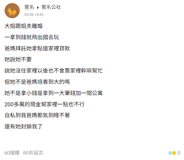 據《CTWANT》報導,有位網友近日在「匿名公社」發文抱怨,大姊跟姊夫離婚以後,分到200多萬的現金,加上一間公寓,爸媽就拜託她拿出一點錢,幫家裡還貸款,沒想到對方果斷拒絕:「沒住家裡以後也不會靠家裡,幹嘛幫忙?」
