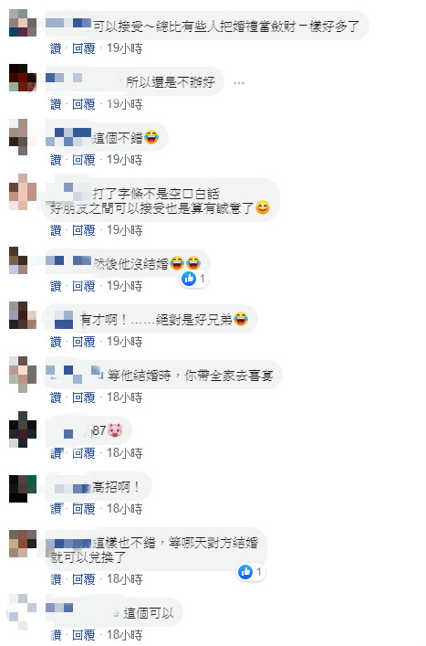 不過也有另一派網友持正面意見力挺好友:「蠻實用的啊,下次可以抵用!」「是真兄弟不用包,我寧要人來,不要只來包錢」、「換個角度想,你兄弟寧願丟臉也要出席,也不介意你下次回禮用字條,看來是真兄弟」、「兄弟的祝福是無價的,每個人都有困難的時候,就當請他喝個喜酒」