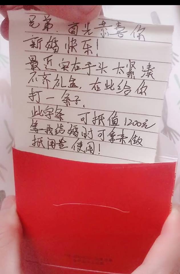 新郎透露,一打開紅包不是鈔票,只有一張上面寫了57字的紙條:「兄弟,首先恭喜你新婚快樂!最近實在手頭太緊,湊不齊禮盒,在此給你打一條子。」看著看著重點來了:「此字條,可抵值1200元,等我結婚時可拿來做抵用券使用」原PO一看超無言,收到這樣的「兄弟紅包」內心五味雜陳....