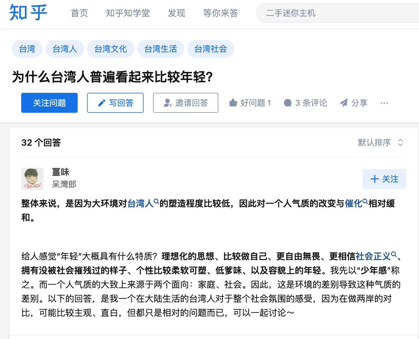 日前一名中國網友就在論壇《知乎》上發問「為什麼台灣人普遍看起來比較年輕?」也有許多網友相當認同他的說法,並表示台灣不管是路人或是明星,到30、40歲看起來都特別凍齡,就像歲月從來沒有在他們的臉上留下痕跡。