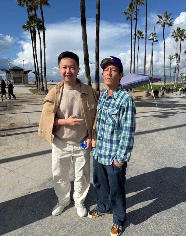 照片裡,他頂著鴨舌帽站在洛杉磯街邊,帽檐投下的陰影把顴骨削得更尖,T恤空蕩蕩掛在身上,像是誰家哥哥熬夜打遊戲出來倒垃圾,被路人一把逮住合影。