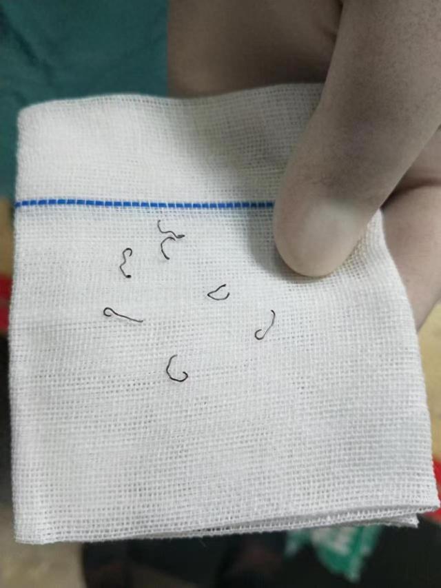 「當時我們不知道這些,醫生沒告訴我們。」周女士說,當時她曾經被要求額外交8000多元的吻合器費用,但醫生卻表示這是一種試驗品藥物,而且費用是醫院收的,醫保局不報銷。礙於熟人面子,還是交了錢。周女士說,可能正是因為使用了這個吻合器,她在術中曾經大出血。 出院不久,周女士開始出現肛門內劇痛、流膿水,墜脹感強烈,可以摸到有硬塊。周女士說,自己找到手術醫生,對方表示不要緊,說出現這樣的情況是因為給她使用的那種藥品,無需大驚小怪,仍未說明內置吻合器的情況。 住院一周治療後症狀減輕,周女士出院。結果不久,同樣的癥狀再度襲來,難以忍受的周女士再次入院,注射止痛針都效果不佳。「我痛的受不了,醫生跟我說了會給我取釘子。」周女士表示,此時她仍不清楚是怎麼回事,還曾打電話跟老公探討疑惑自己肛門中怎麼會有釘子。「當天取出來3個釘子,馬上就不疼了,實際上裡面一共有30多個。」周女士說,這次她沒敢貿然出院,在醫院觀察兩三天後,強烈的疼痛感再次出現。 周女士說,此時,這個醫生也束手無策了,就於2014年2月底把周女士轉到成都的大醫院去治療,「成都的醫生一檢查就說我已經錯過了最佳的取釘子時間,應該在一個月內取出,現在已經被包裹在腸子組織中。」周女士說,從那以後的10年間,她不是在醫院住院、手術,就是在家中躺著,不但忍受了巨大的痛苦,先後又17次住院,其中8次手術,從腸道組織中剝離金屬釘,直到2022年底才徹底取完。