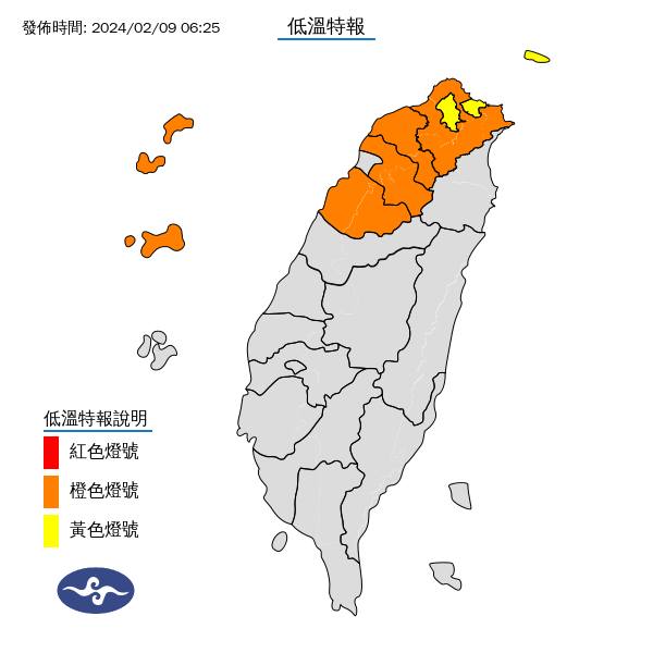 中央氣象署今日發布低溫特報,基隆市、臺北市達到「黃色燈號」,有10度以下氣溫發生的機率;「橙色燈號」則是代表非常寒冷,在新北市、桃園市、新竹縣、苗栗縣、金門縣、連江縣都為「橙色燈號」,尤其連江縣氣溫有機會落在6度左右或以下。