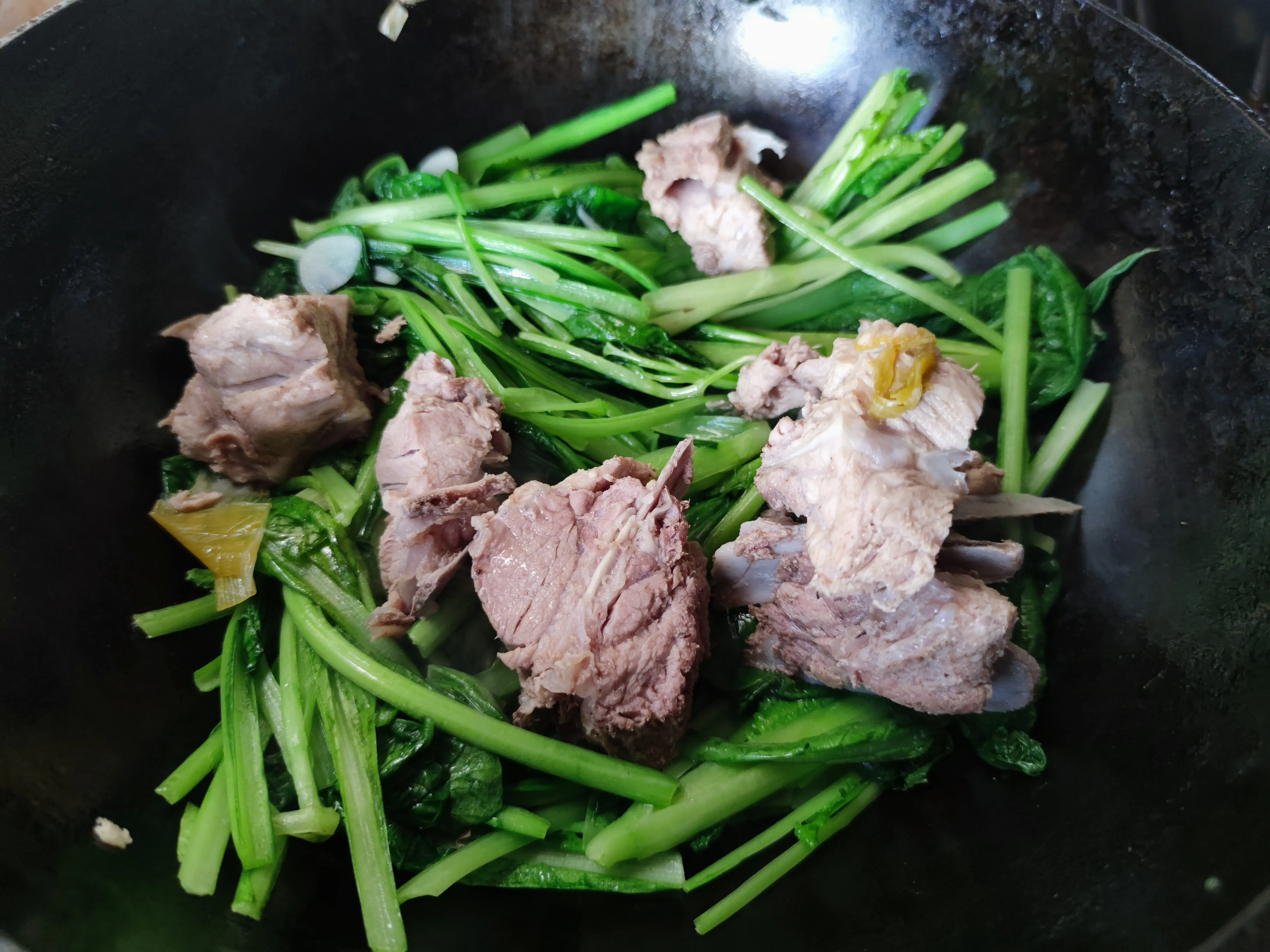 3.鍋中入油爆香蔥姜蒜,下入摘洗乾淨的小白菜煸炒出水汽,烹入料酒後加入壓好的排骨。