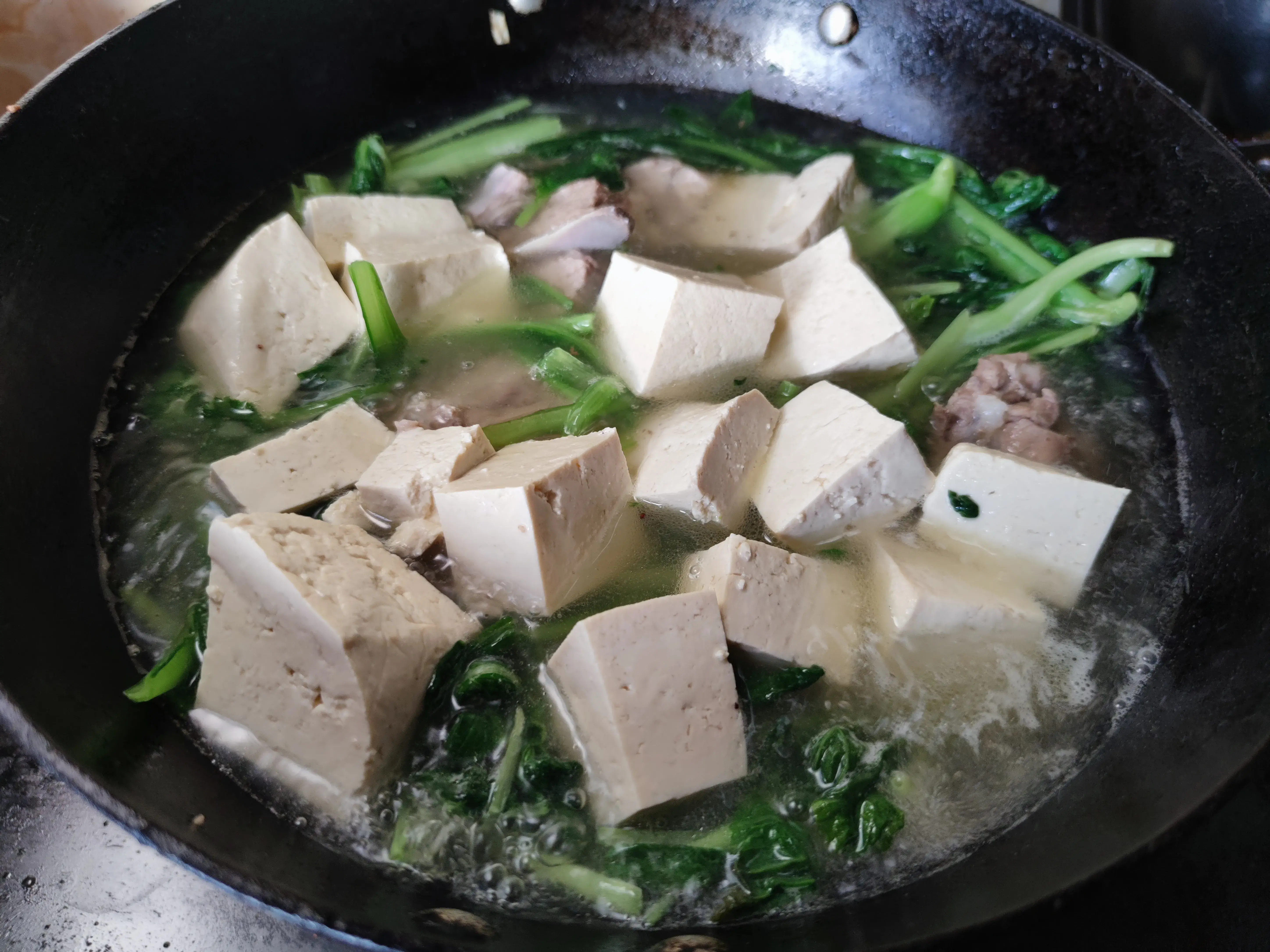 4.壓排骨的原湯撈去殘渣,把排骨湯倒入鍋中,下入切好的豆腐,大火燒開後轉小火慢燉,燉至湯汁濃稠後加入鹽和胡椒粉調味後即可出鍋享用。