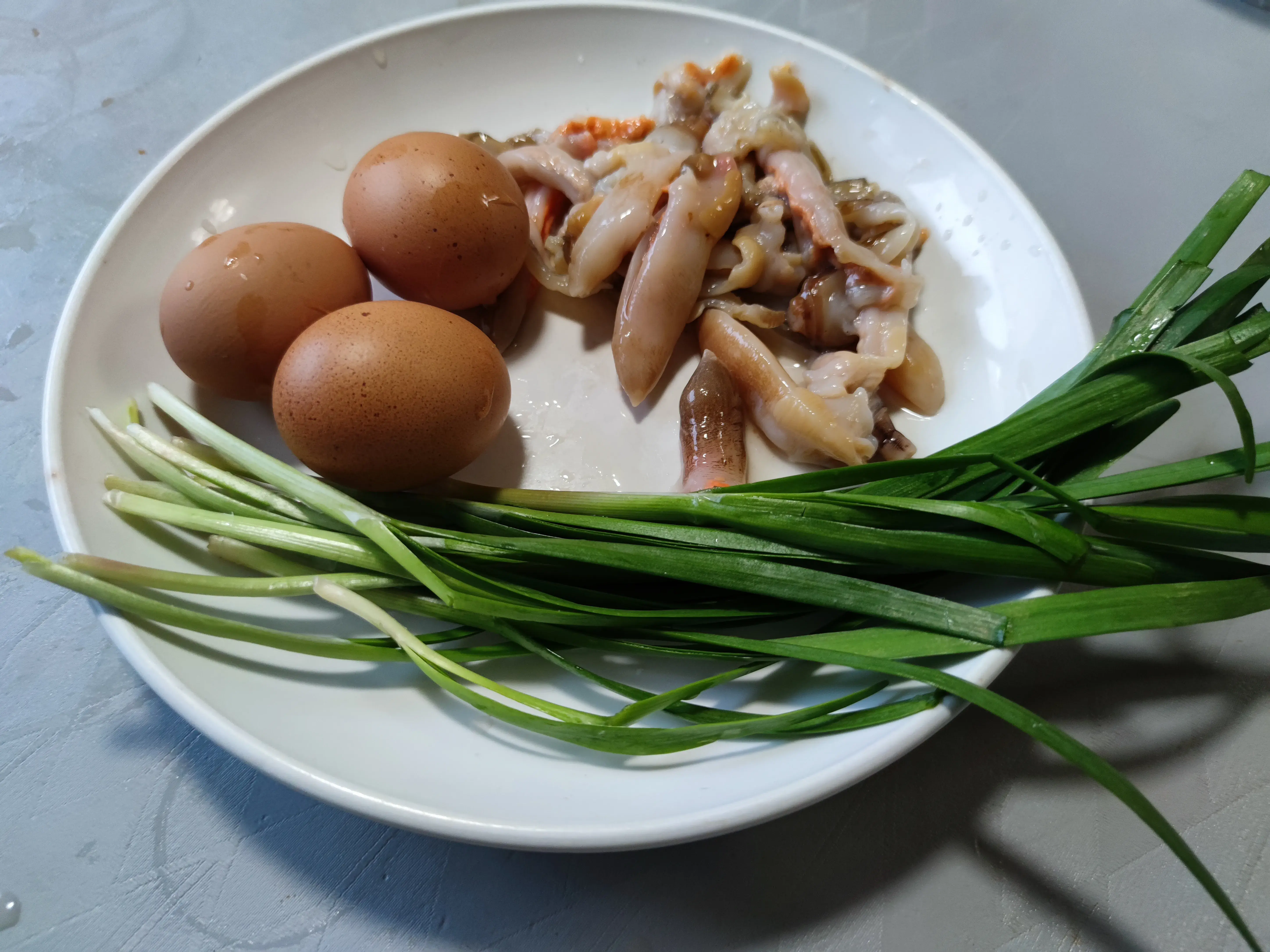 1.韭菜摘洗乾淨後切成小段,雞蛋打散後加入料酒、鹽和胡椒粉攪拌均勻,竹蟶肉清理乾淨後備用。