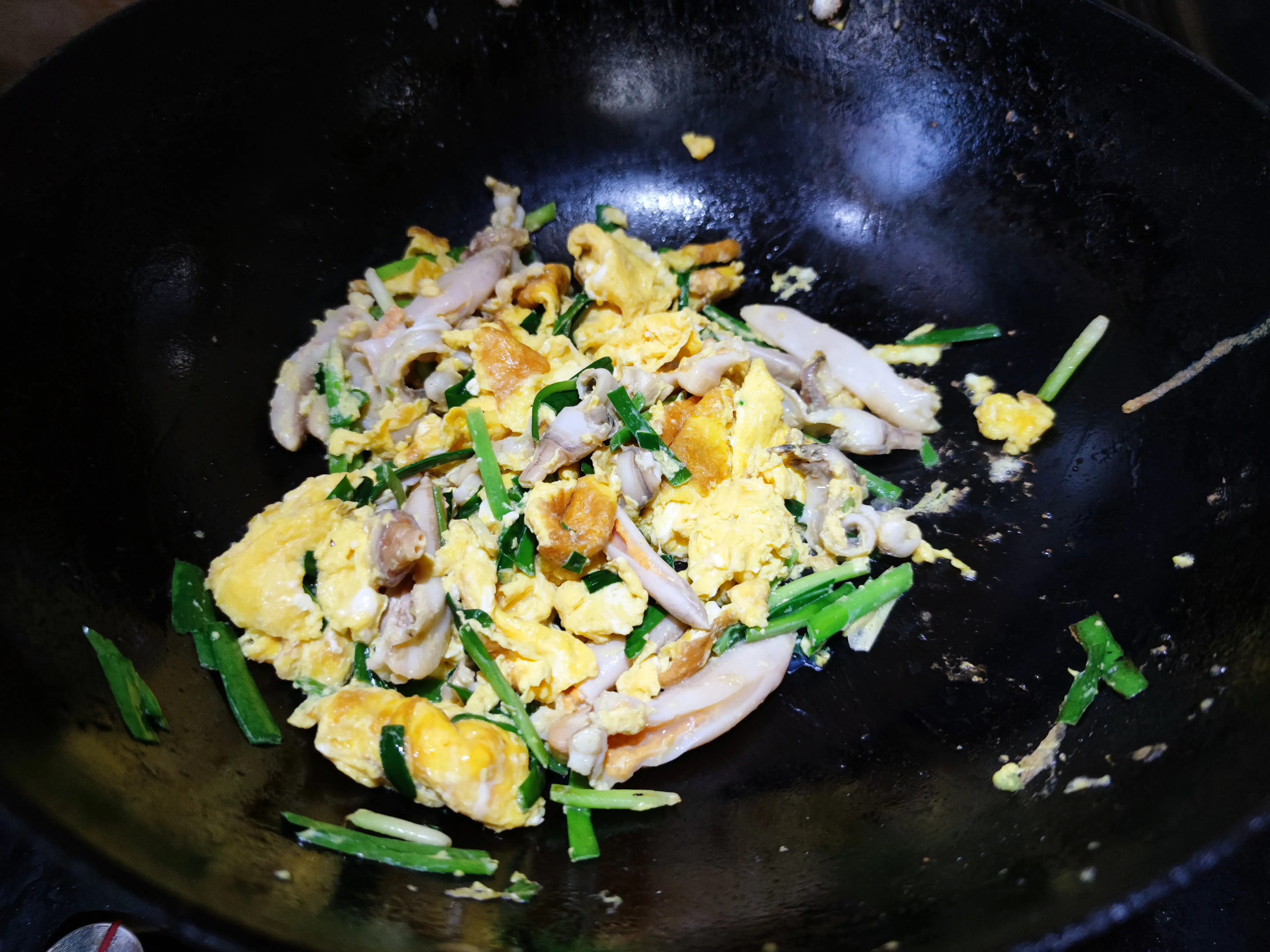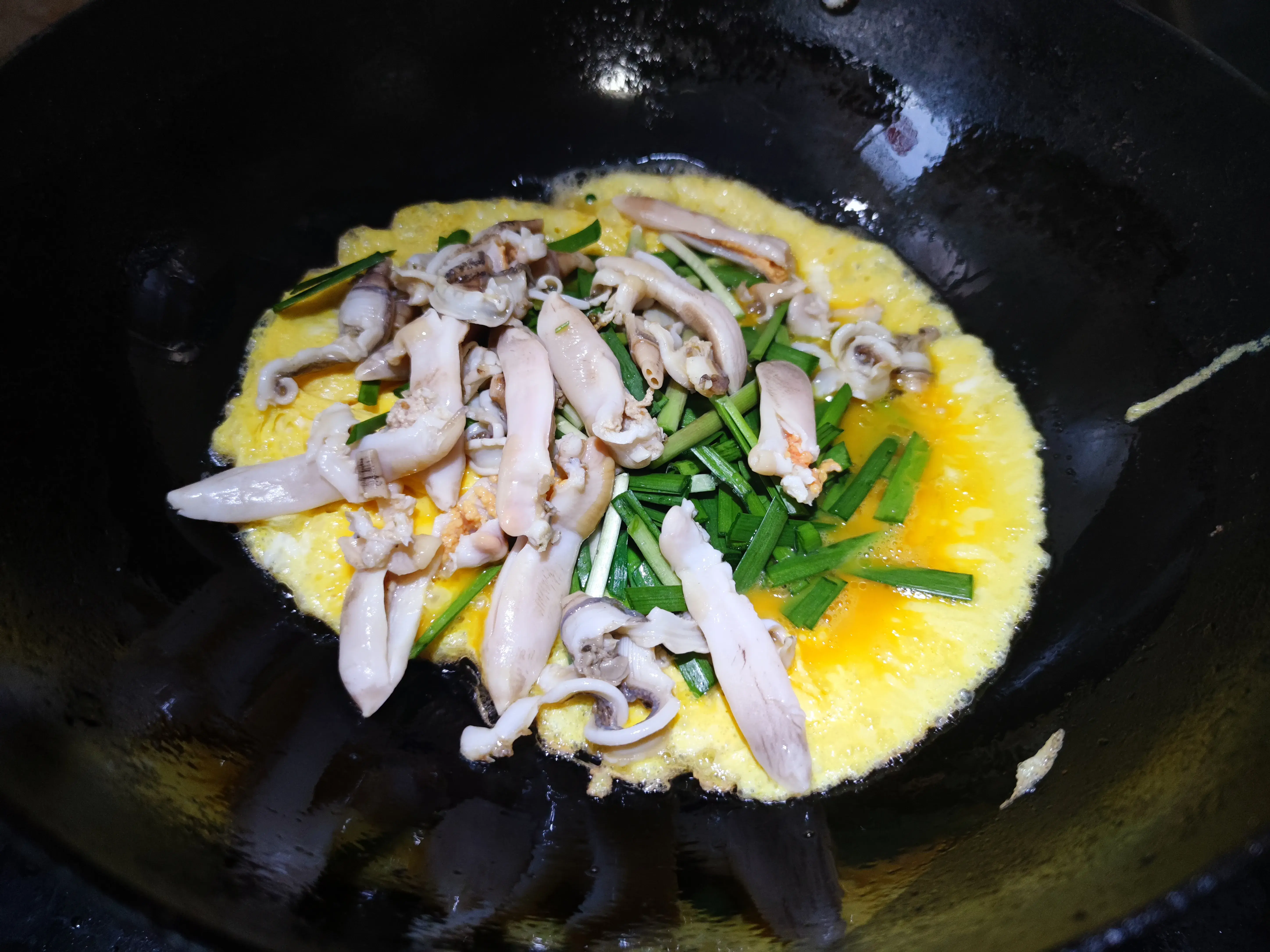 3.鍋中入油,油熱後下入蛋液煎至一面金黃定型後,下入竹蟶肉和韭菜段。