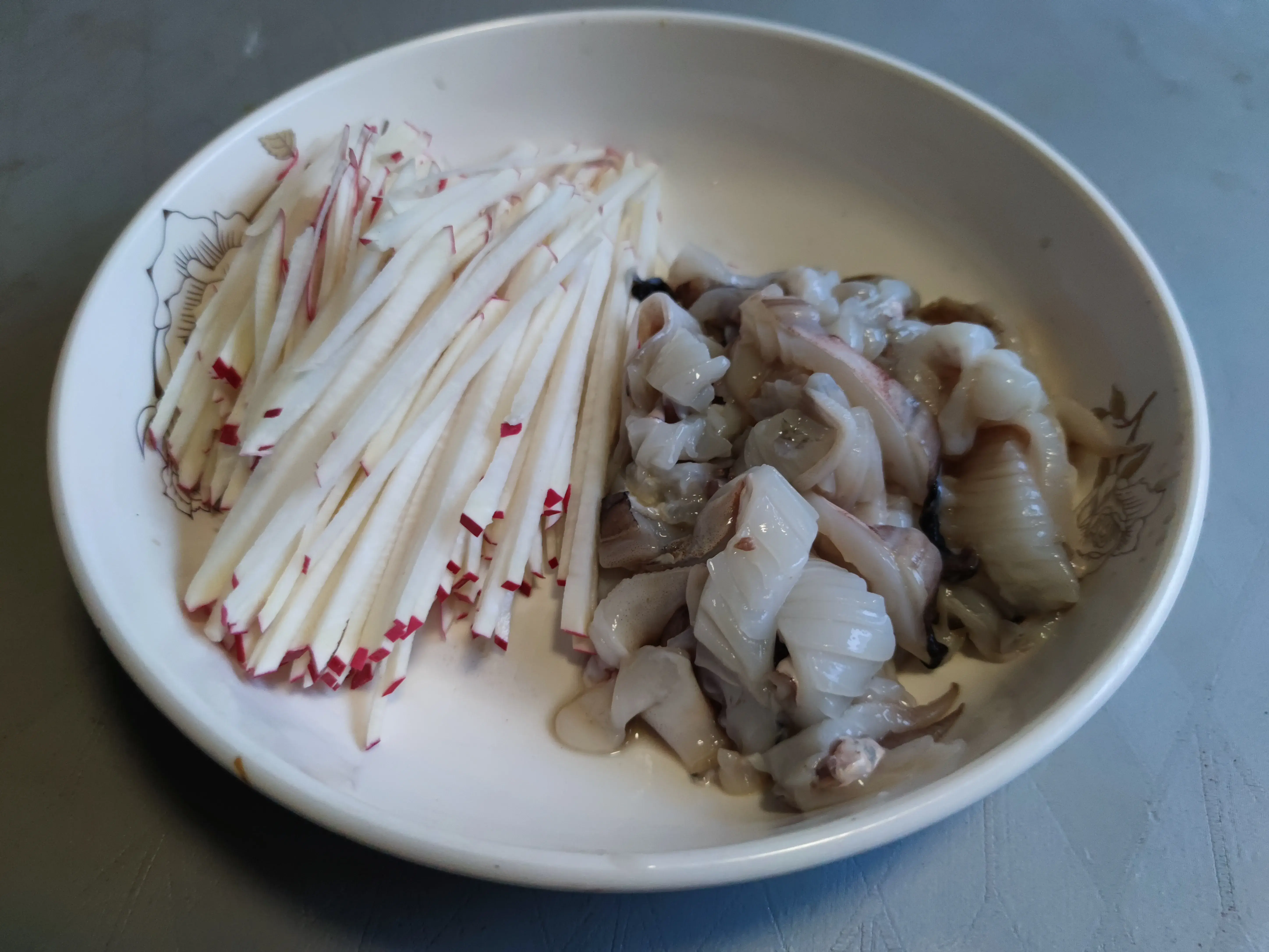 1.蘿蔔颳去老皮後清洗乾淨,然後切成細絲,墨魚處理乾淨後改上十字花刀,切成小條備用。