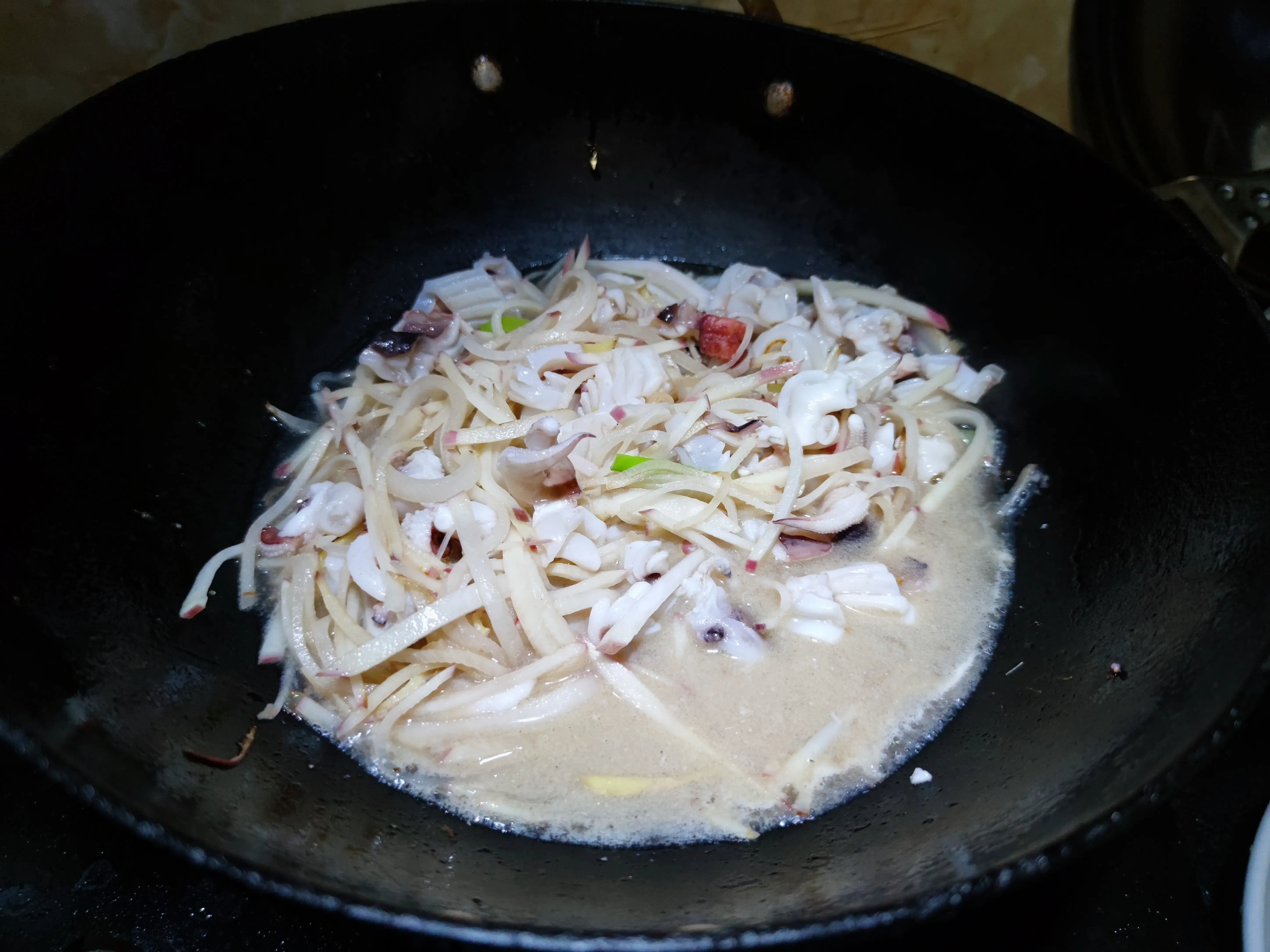 3.鍋中下入改好刀的墨魚翻炒均勻,添入適量的湯汁。