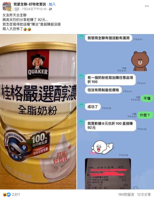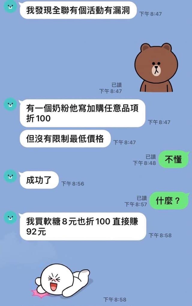 根據《ETtoday》報導,一名男網友在臉書社團「我愛全聯-老實說」中分享趣事,只見他貼出和女友的聊天對話,女友很興奮表示:「我發現全聯活動有Bug(漏洞)!」原來有一款奶粉正在做優惠活動,寫加購任意品項就能折100元,讓她眼睛一亮的是,這活動竟然沒有限制最低價格,當下她跑去找最低價格的商品,僅加購價值8元的軟糖就能成功折100元,讓她開心喊話:「直接賺92元!」