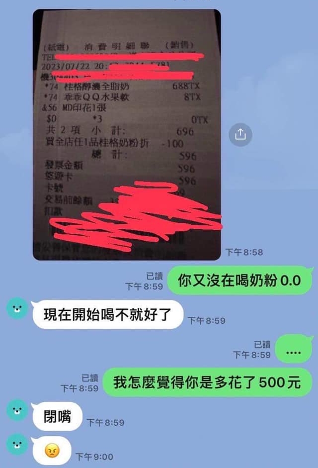 雖然有優惠,但男友不解吐槽女友:「妳又沒在喝奶粉...」認為真正的關鍵是她買了平常不需要的商品,反而多花了500元,對此女友不以為然表示:「現在開始喝不就好了?」看著女友的購物明細,認為女友的「賺錢法」會越賺越沒錢,無奈感嘆:「商人太恐怖了!」讓消費者花錢花得心甘情願還覺得自己賺到了!