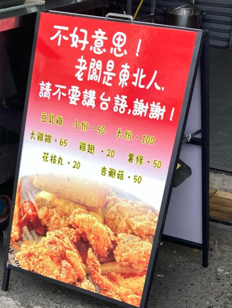嘉義一間新開的鹽酥雞店由來自中國東北的老闆經營,因擔心溝通障礙而在店門口擺特「不好意思!老闆是東北人,請不要講台語,謝謝!」的告示牌,沒想到卻引發不少台灣網友不滿,認為既然來台灣做生意,學習當地語言應該是基本禮貌。隨著網路上的謾罵聲愈來愈多,老闆也親自道歉了。