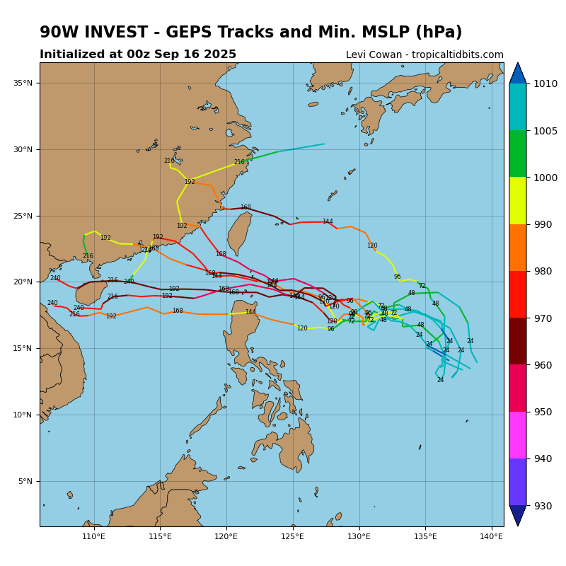 氣象專家進一步分析,由於冷空氣勢力不足,西風槽南伸幅度有限,難以影響太平洋高壓的增強趨勢。加上北方西風高壓脊與太平洋高壓可能產生疊加效應,使高壓系統更加強勢,90W接近台灣時路徑可能偏西。不過系集預報顯示,颱風抵達台灣附近時的路徑仍有相當大的不確定性。