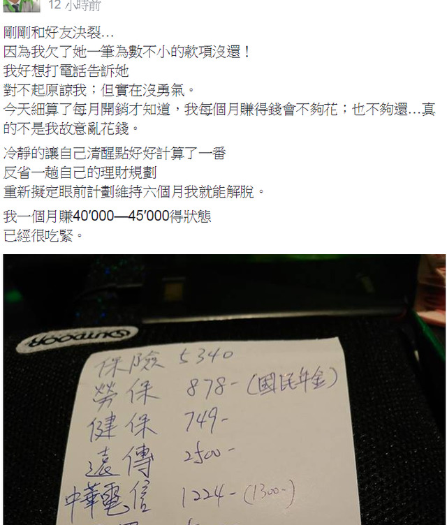 網友委屈上網發文,說他因為欠了好友錢沒還而決裂,解釋他不是故意不還而是「我每個月賺得錢會不夠花,也不夠還…真的不是我故意亂花錢」還公開了他的每月收支明細,結果發現他每月光是電信費就好幾千,還要還車貸等等,林林總總支出就將近快三萬,都快養不活自己了,何況還要還錢勒!