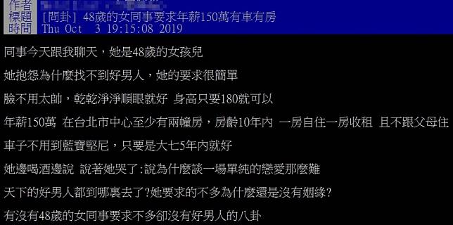 對於這位48歲女同事的要求,讓原Po也好奇地忍不住上PTT發問「有沒有48歲的女同事要求不多卻沒有好男人的八卦」?