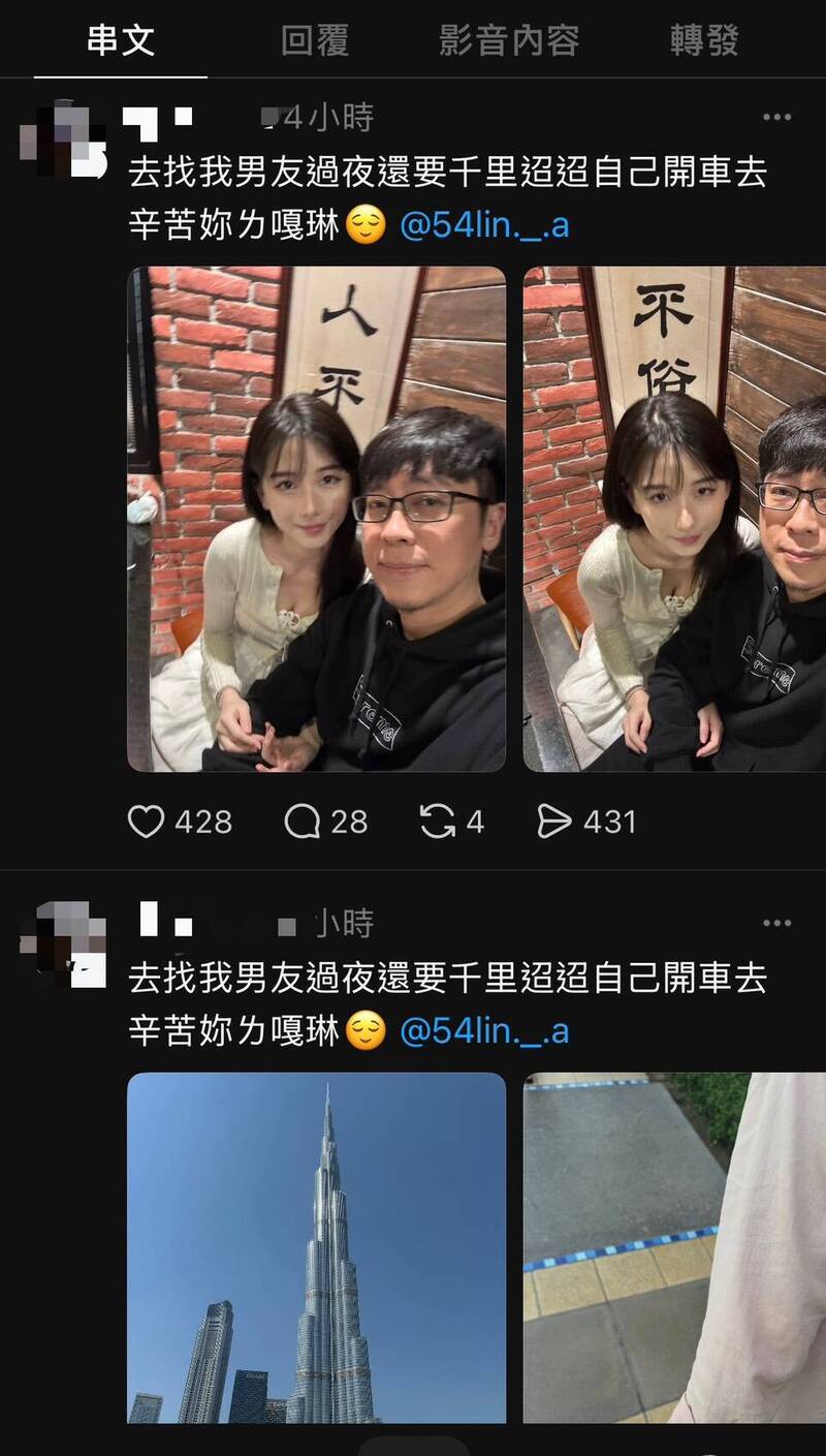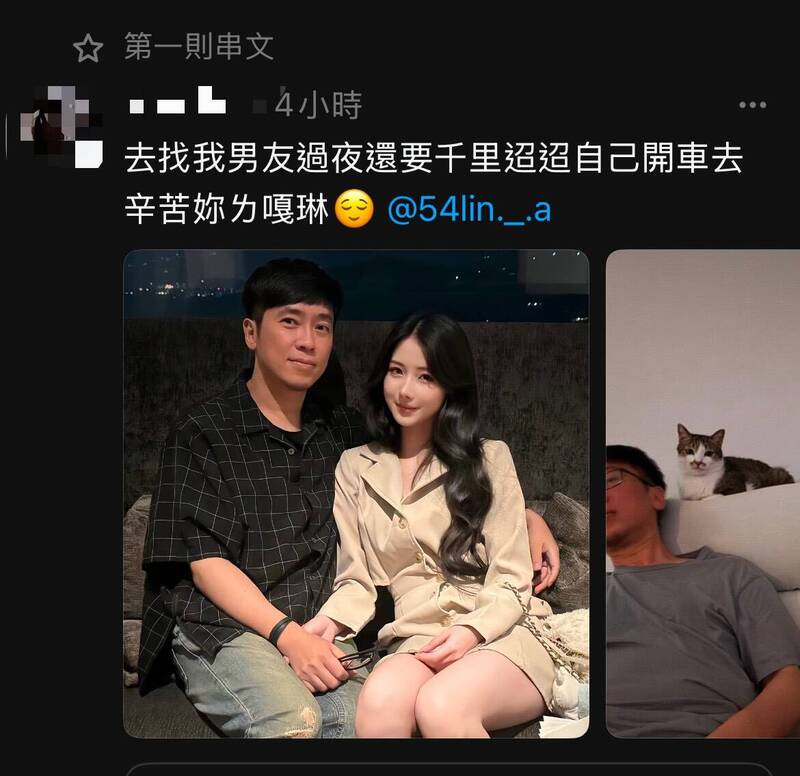 而在事發幾天後,一位自稱是正宮的女網友在社群平台「Threads」發文,公開多張嘎琳與黃苡峻的親密合照,包含兩人深情接吻的畫面,力證兩人關係親密,「去找我男友過夜,還要千里迢迢自己開車去,辛苦妳了嘎琳」,她更直接標記嘎琳的帳號,要求對方出面說明。然而,當她在嘎琳的貼文下留言時,卻遭到檢舉刪除。