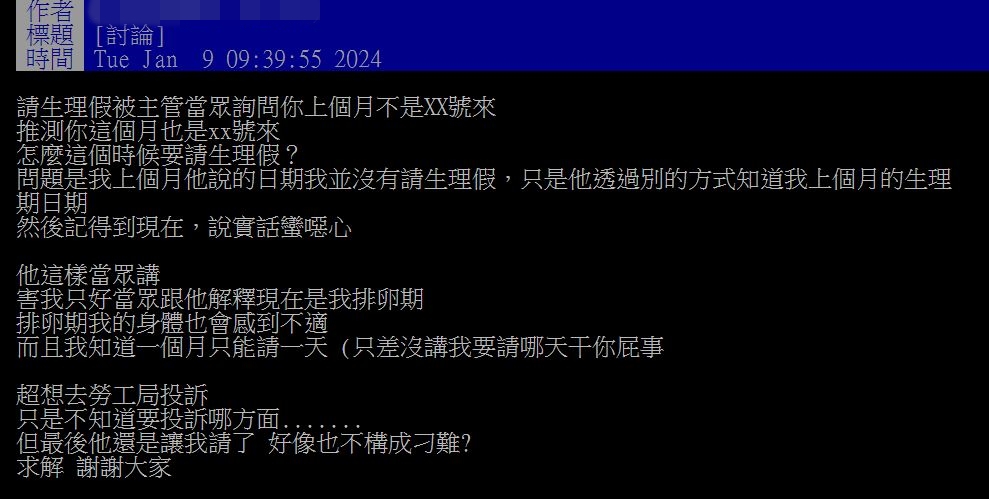 其他網友則分享:「朋友公司的女主管,也會看她請生理假日期,就算是女生,也讓人很不舒服。」、「前主管很聰明,叫大家請假通通填私事,他不會主動問緣由。」原PO也感謝道:「我會查一下相關資訊,並考慮是否提告。」