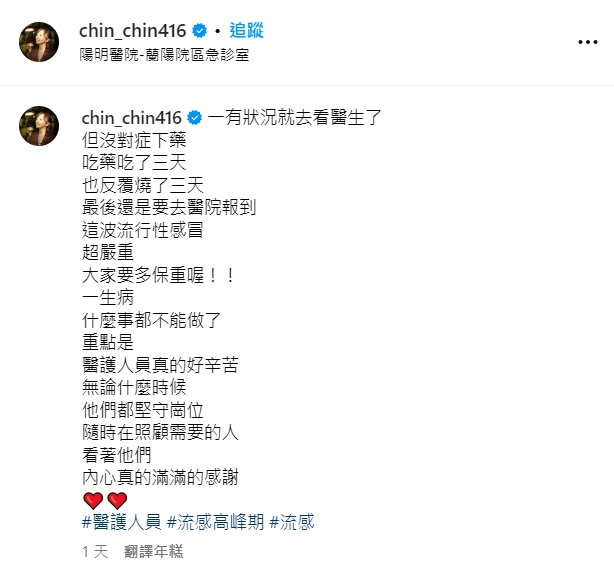 從季芹PO出的照片中可以看到,她雙眼無神憔悴盯著鏡頭,看得出來非常難受,雖然如此膚質狀況還是非常好,她無奈地說:「一生病,什麼事都不能做了。」並說看到醫護人員忙進忙出,心裡滿是感激,也謝謝所有醫護人員,並提醒粉絲最近流感滿嚴重的,一定要多多保重。