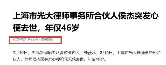 在官方發布的消息中提到,侯傑律師是因突發心梗搶救無效去世。