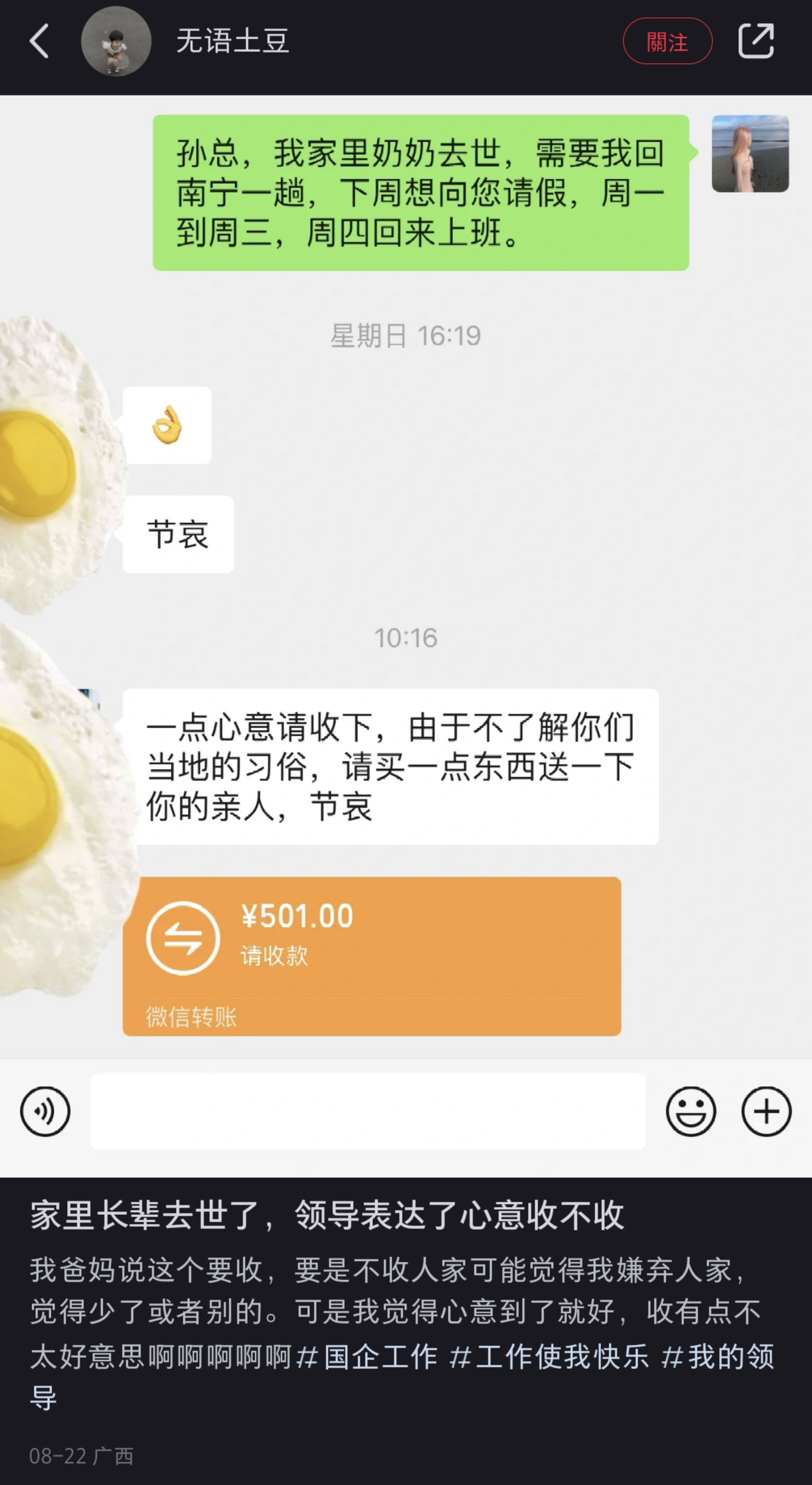「主管第二天還能想起你喪假的事,還能給你轉501的紅包,一個是這個紅包挺大了真的,其次是他還能想到基數的風俗,可以看出來這個主管情商高,人還不錯」
