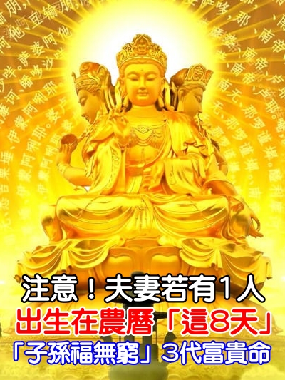 婚姻是每一個人生命中的至關重要的大事,選對了人之後的生活可能會一馬平川,五福臨門,選錯了則會產生許多頭疼、或者不順等問題。生日對於每個人來說都是很重要的,一個人的出生,不僅是新生命的出現,更是一家人開心的事情,你的與眾不同,不僅是對自己來說,更是對家人來說。夫妻有1人出生在農曆這8天,子子孫孫福無窮,3代富貴命!