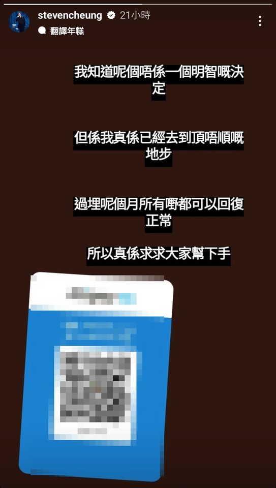 日前,他因為家中經濟狀態陷入困境,竟突發奇想地在IG發布「收款QR code」,希望能獲得善心人士的「救濟」。但此舉卻被網友唾棄,認為他這種行為簡直是乞討。在網路一面倒聲討下,他於3日晚間公開澄清,表示在發布後收到不少介紹工作的訊息,「但我已經有兩份工作」,強調自己並不是遊手好閒。