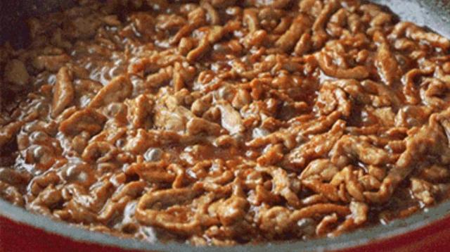 3、鍋留底油,倒入調好的料汁;小火邊加熱邊攪拌,直到料汁變得黏稠之後,把炒好的肉絲倒進去,翻炒均勻,炒至湯汁黏稠後即可關火出鍋。
